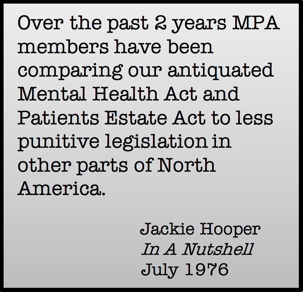 From the beginning of MPA, decisions over employment were made by elections held at general membership meetings. The waged work that Jackie undertook during her years at the organization illustrates complex and key aspects of work at MPA. Like many other members voted into MPA paid positions, Jackie brought to her work skills acquired through education and previous employment. But at MPA, Jackie’s identity and expertise as a user of mental health services was also regarded as important, overlapping with an emerging set of credentials as an advocate and activist. Over the 1970s she wrote for and edited the Nutshell, worked as MPA office coordinator, was an MPA liaison with the provincial government, and initiated innovative supportive apartment housing projects at both Coast Mental Health and MPA.
