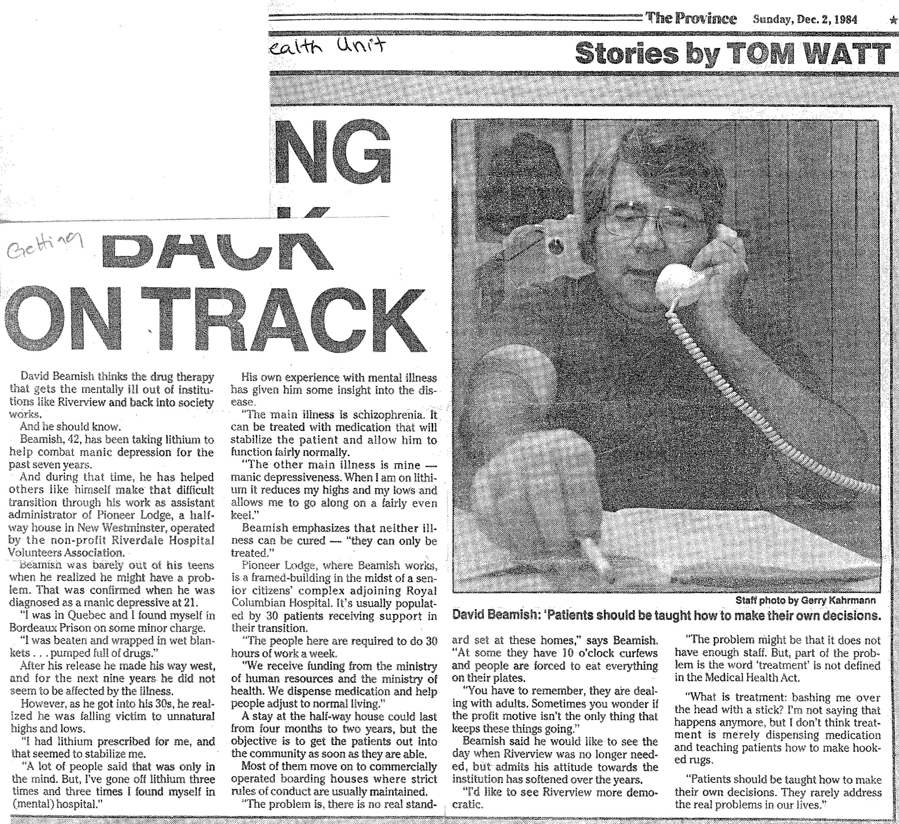 By this point Beamish had become engaged with internal patient politics at Riverview Hospital as well. He and ally Fran Phillips became active members of a task committee at Riverview Hospital for a proposed Patients’ Council, likely as MPA representatives.