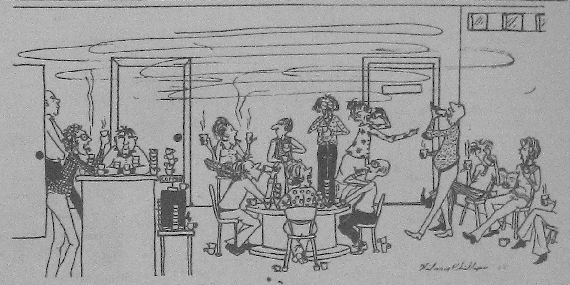 Hilary Phillips’s 1976 cartoon of the Riverview Drop-in shows a lively scene.