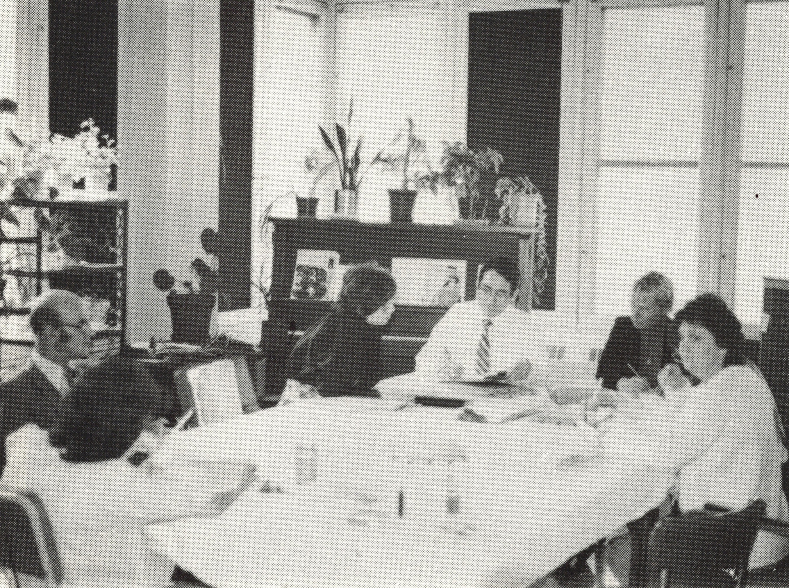 black and white photo of group of people meeting around table, circa 1970s