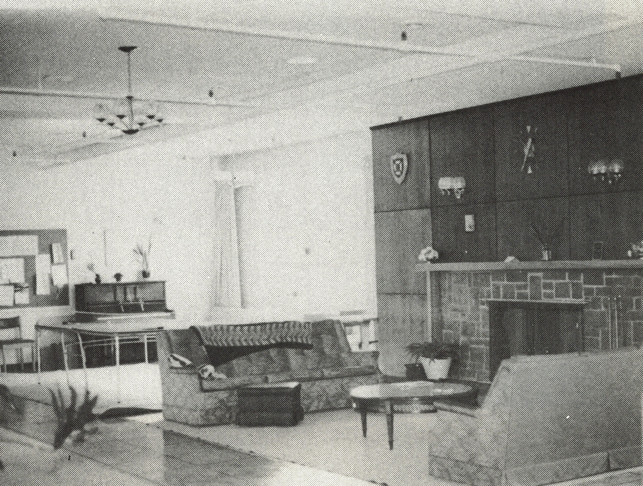 black and white interior shot of living room area, circa 1960s or 1970s