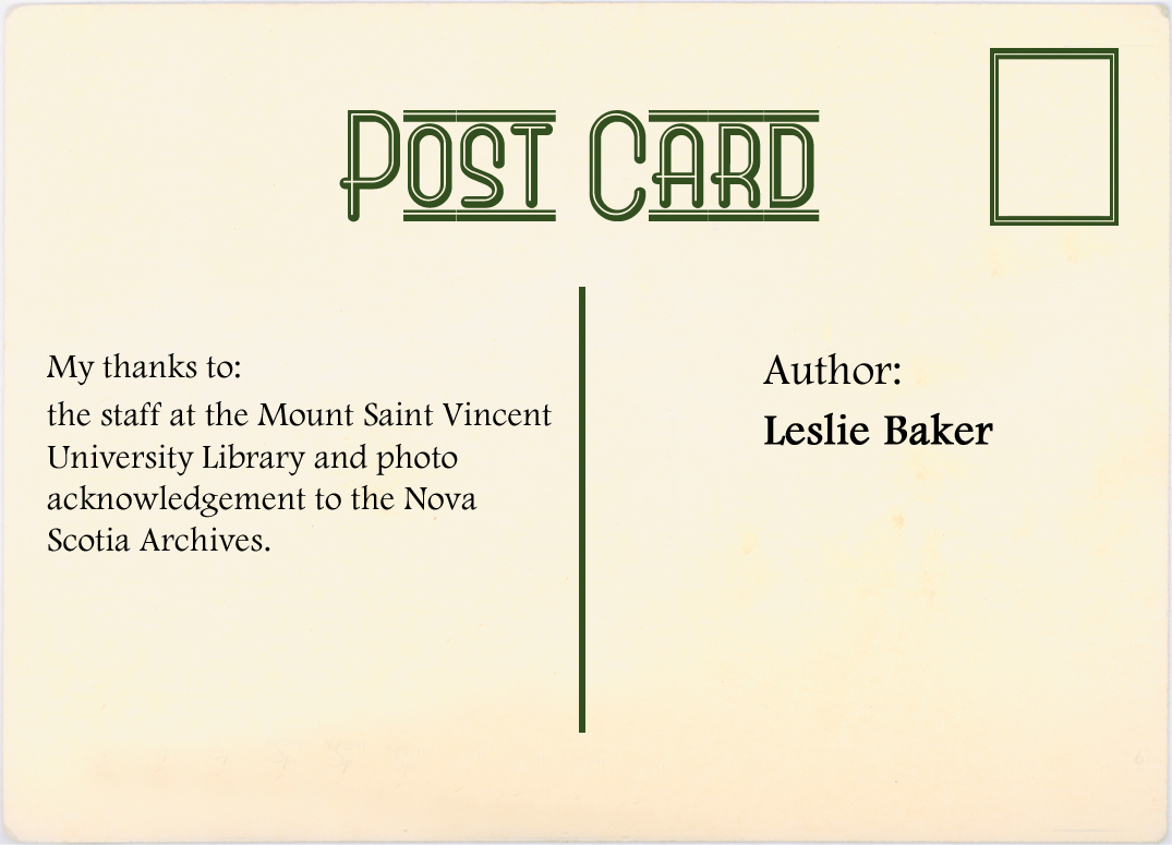 Author: Leslie Baker. My thanks to: the staff at Mount Sain Vincent University Library and photo acknowledgement to the Nova Scotia Archives