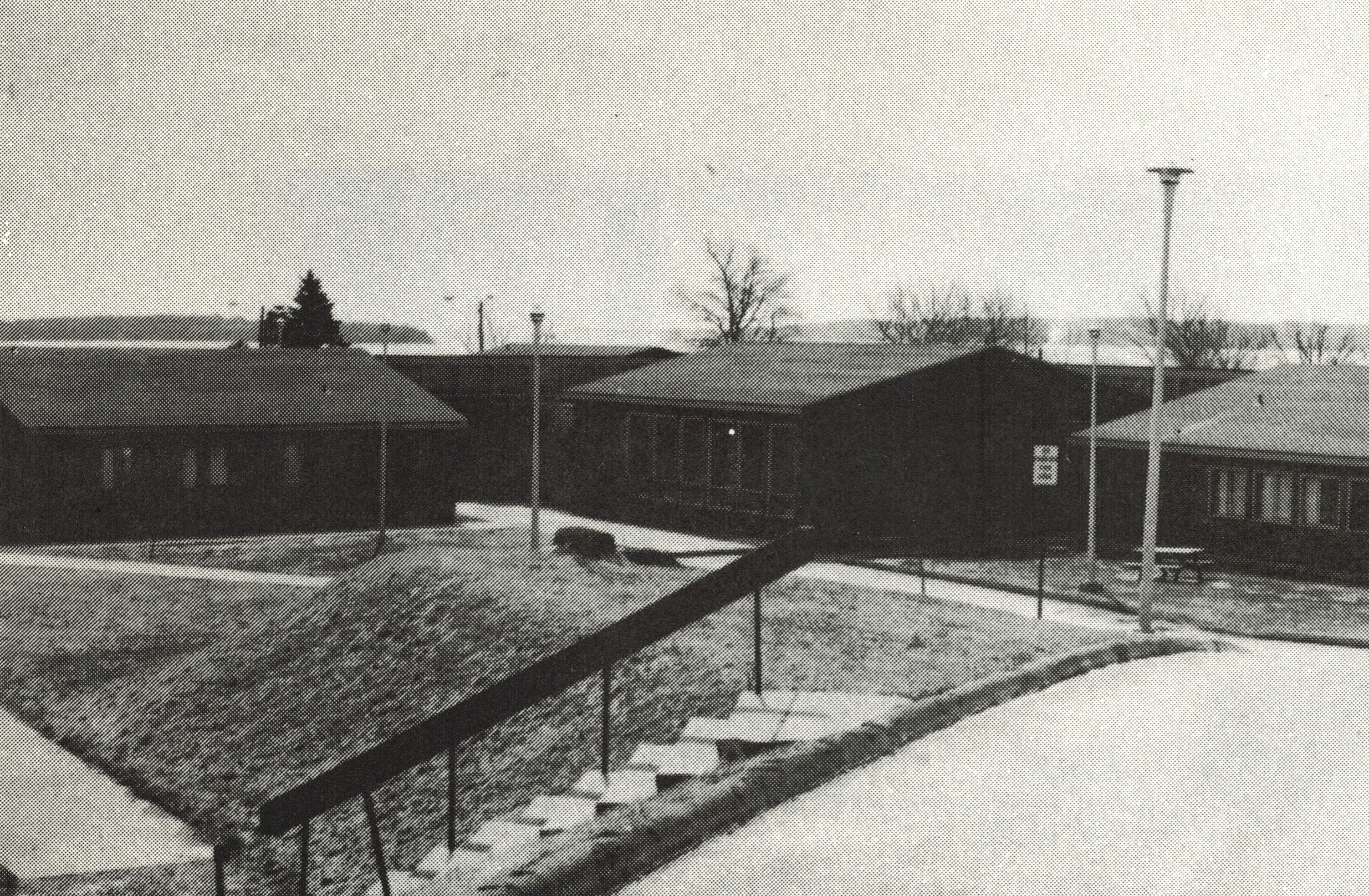 black and white photograph of wing of old brick institutional building, driveway and gardening in front