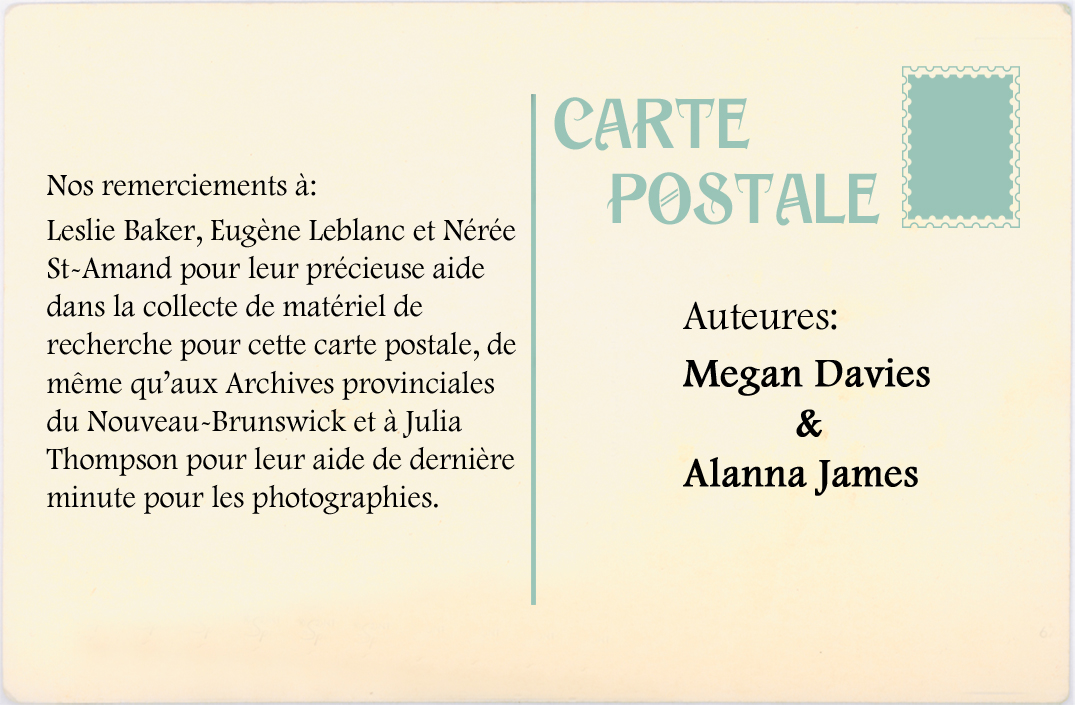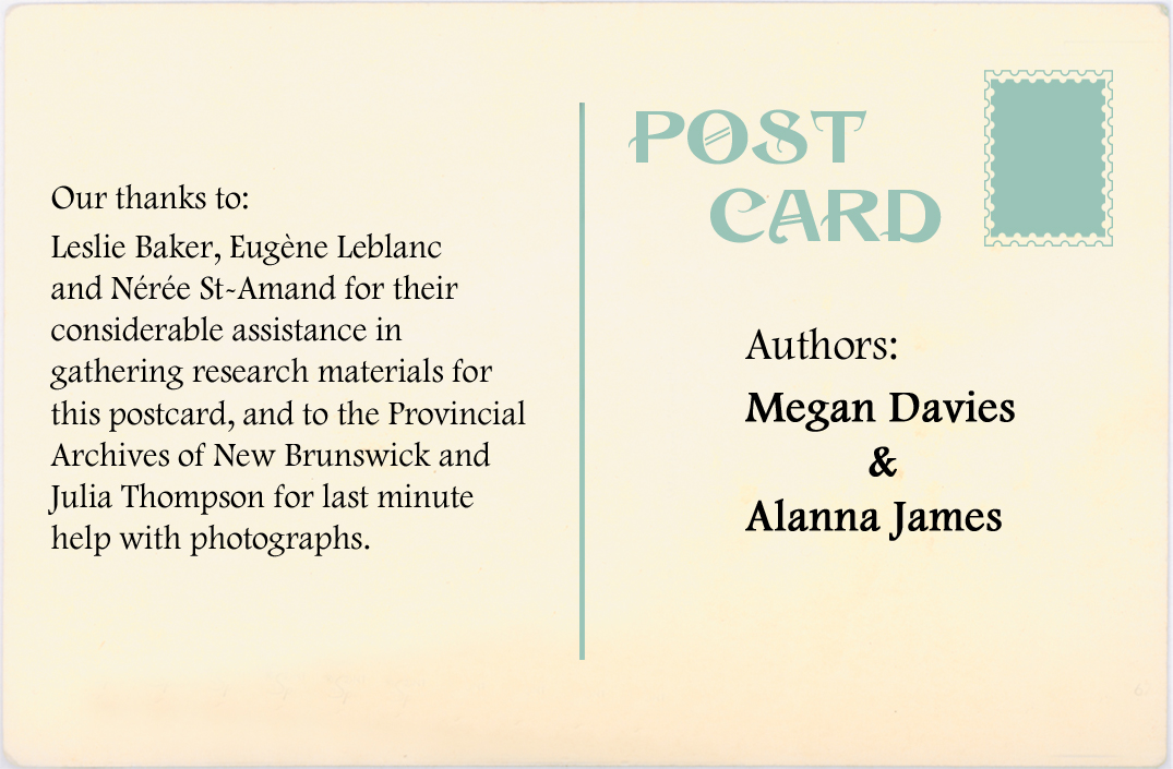Nos remerciements à: Leslie Baker, Eugène Leblanc et Neree St-Amand pour leur précieuse aid dans la collecte de matéiel de recherche pour cette carte postale, de mème qu'aux. Archives provinciales du Nouvequ-Brunswick et à Julia Thompson pour leur aide de dernière minute pour les photographies.  Auteures : Megan Davies & Alanna James