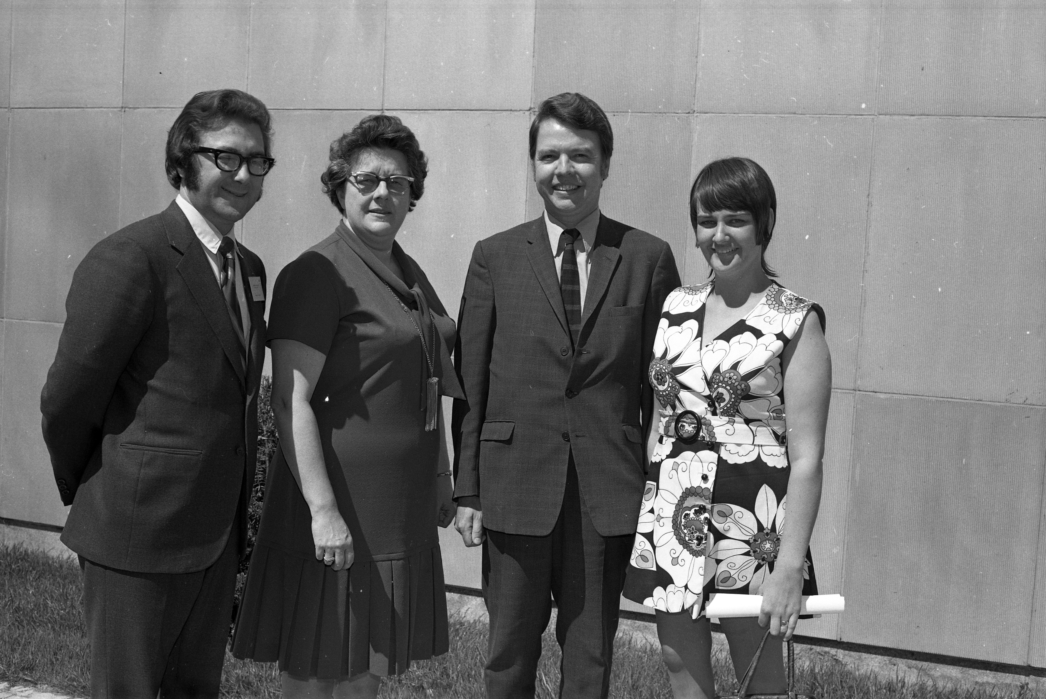 Photo en noir et blanc datant environ des années 1970 avec deux hommes et deux femmes, à l'extérieur, devant un mur de béton