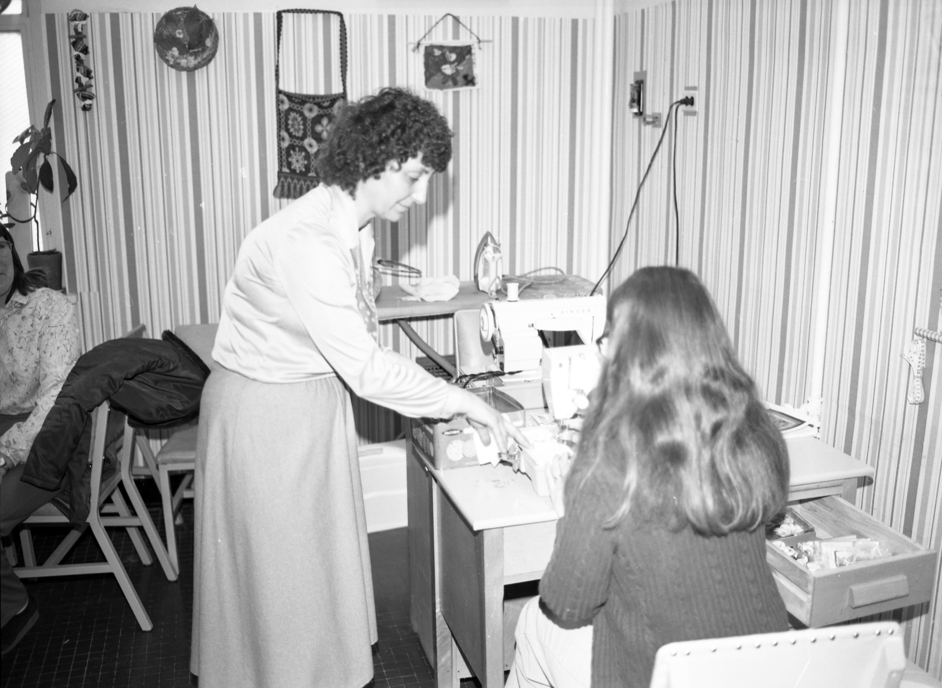 Photo en noir et blanc datant environ des années 1970 avec une femme qui aide une autre femme à utiliser une machine à coudre