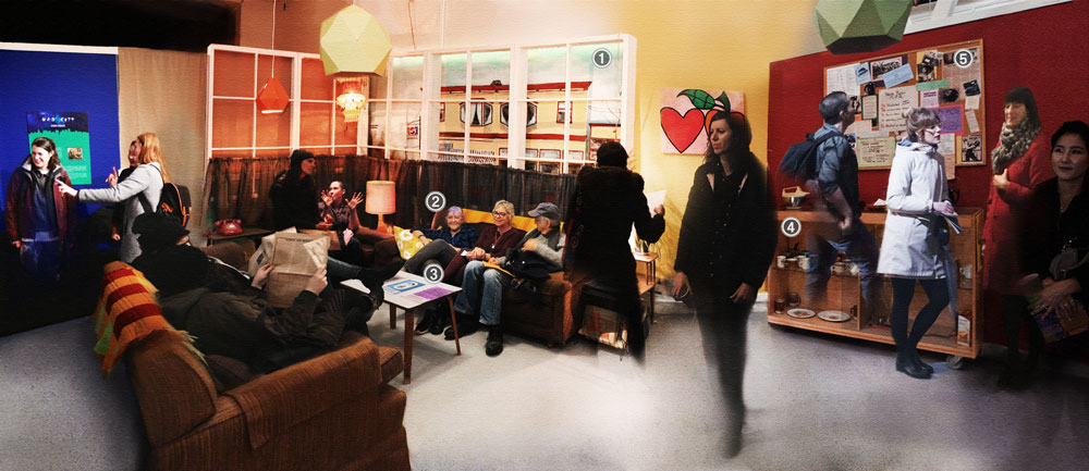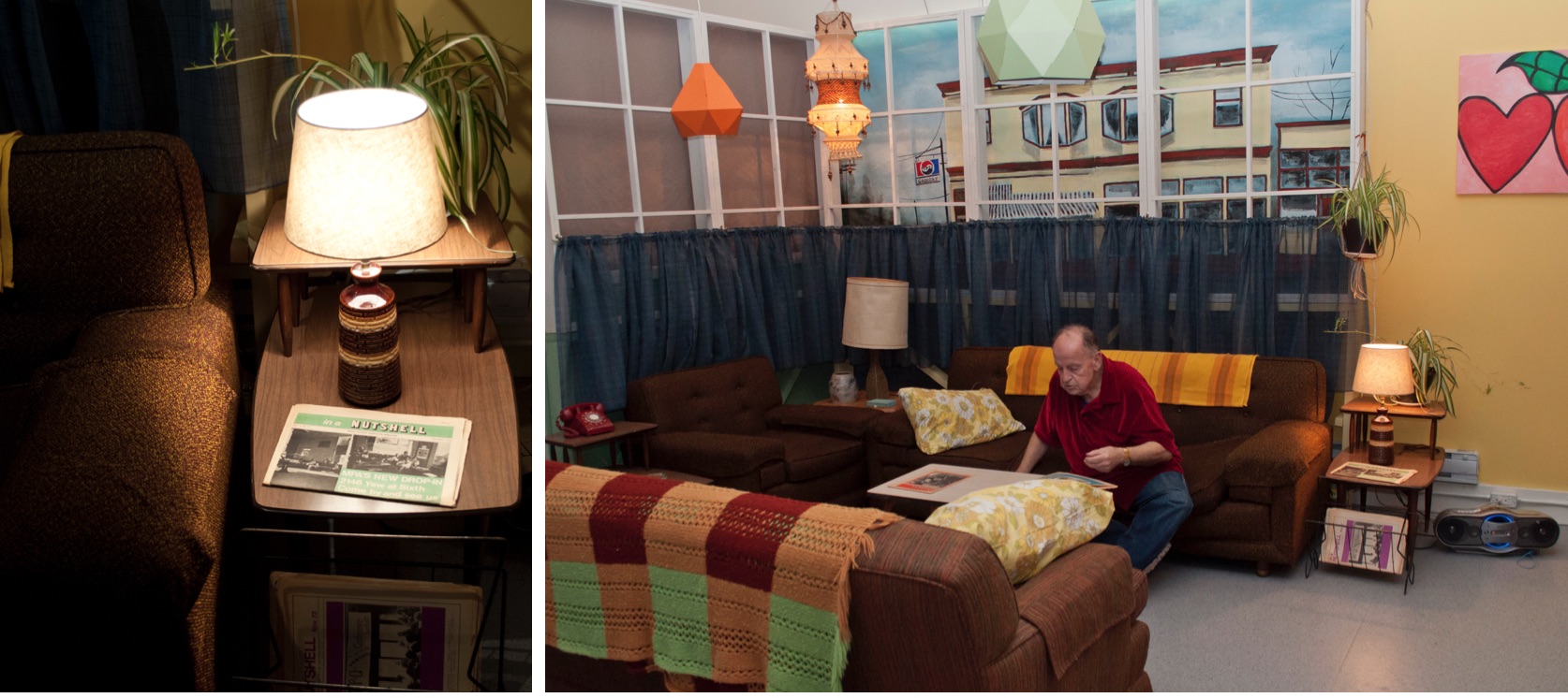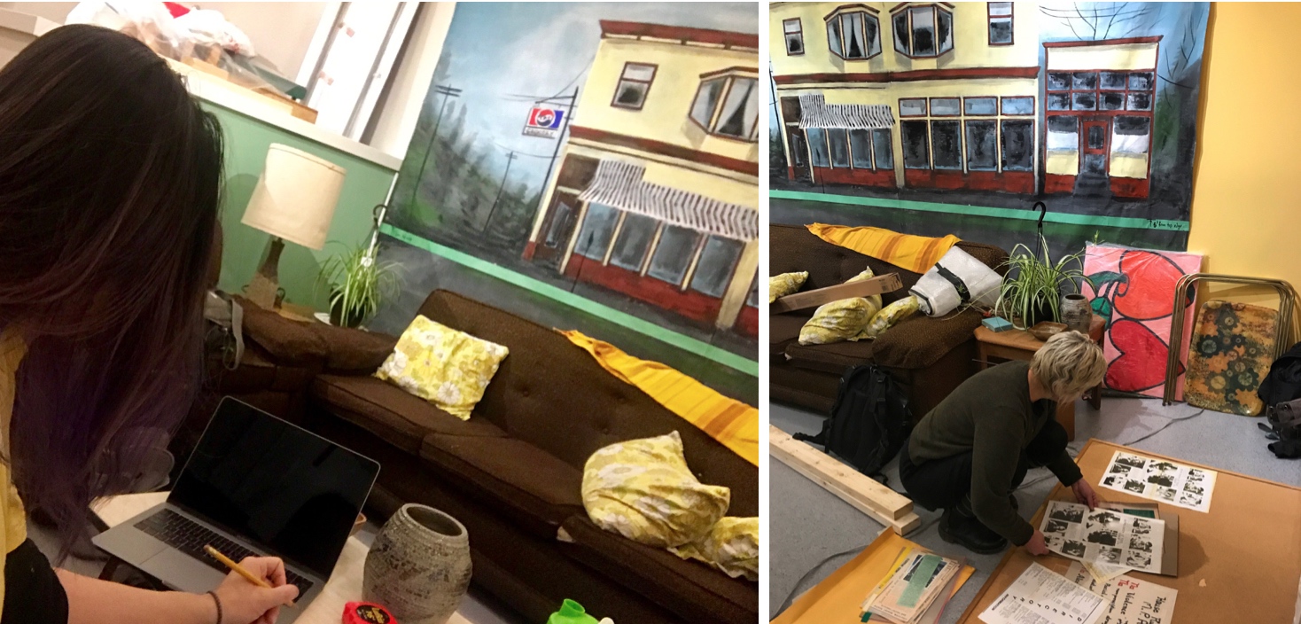 As the team member responsible for recreating the Drop-In on a $1,000. budget, Megan Davies used footage from the 1977 NFB documentary about MPA as a blueprint, scouring Value Village, the Hornby Island Free Store, Craigslist, and friends’ basements for furnishings and decorative items. She convinced her accommodating brother Alan Davies to build five over size window frames in his Saltspring Island workshop, and located a scene painter to recreate the street view outside the Drop-In. Research assistant Cindy Jiang was indispensable, working with Gachet staff to negotiate our use of the gallery space and then employed her early theatre training to literally build a set to enclose the drop-in space and hold the window frames. In addition to some fast work with power tools, Cindy sewed yards of curtains and sourced a vast piece of canvas for our set painter at an unbelievable price of $20.