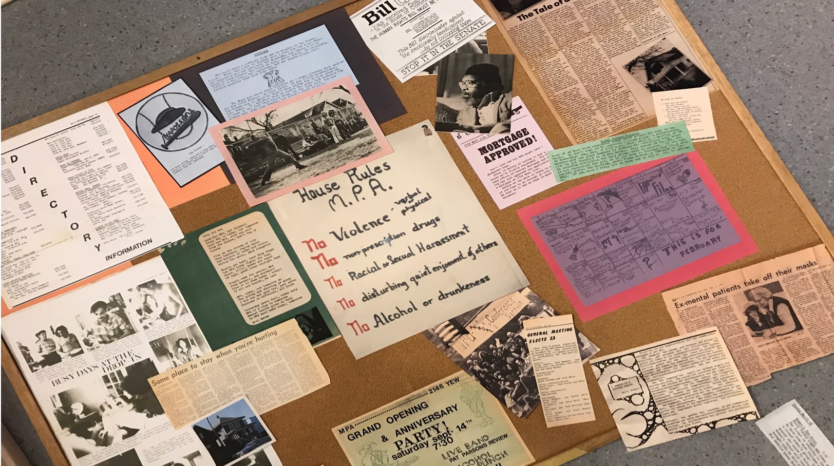 But how to express this blend of politics, work and art? In the mid-70s folks at the MPA Drop-In didn’t bother with a bulletin board, they just stuck stuff up on the walls.  We decided to play a little with the past, creating an imagined current events bulletin board circa 1975 to demonstrate the kaleidoscope of possibilities, humour, action at the MPA Drop-In.