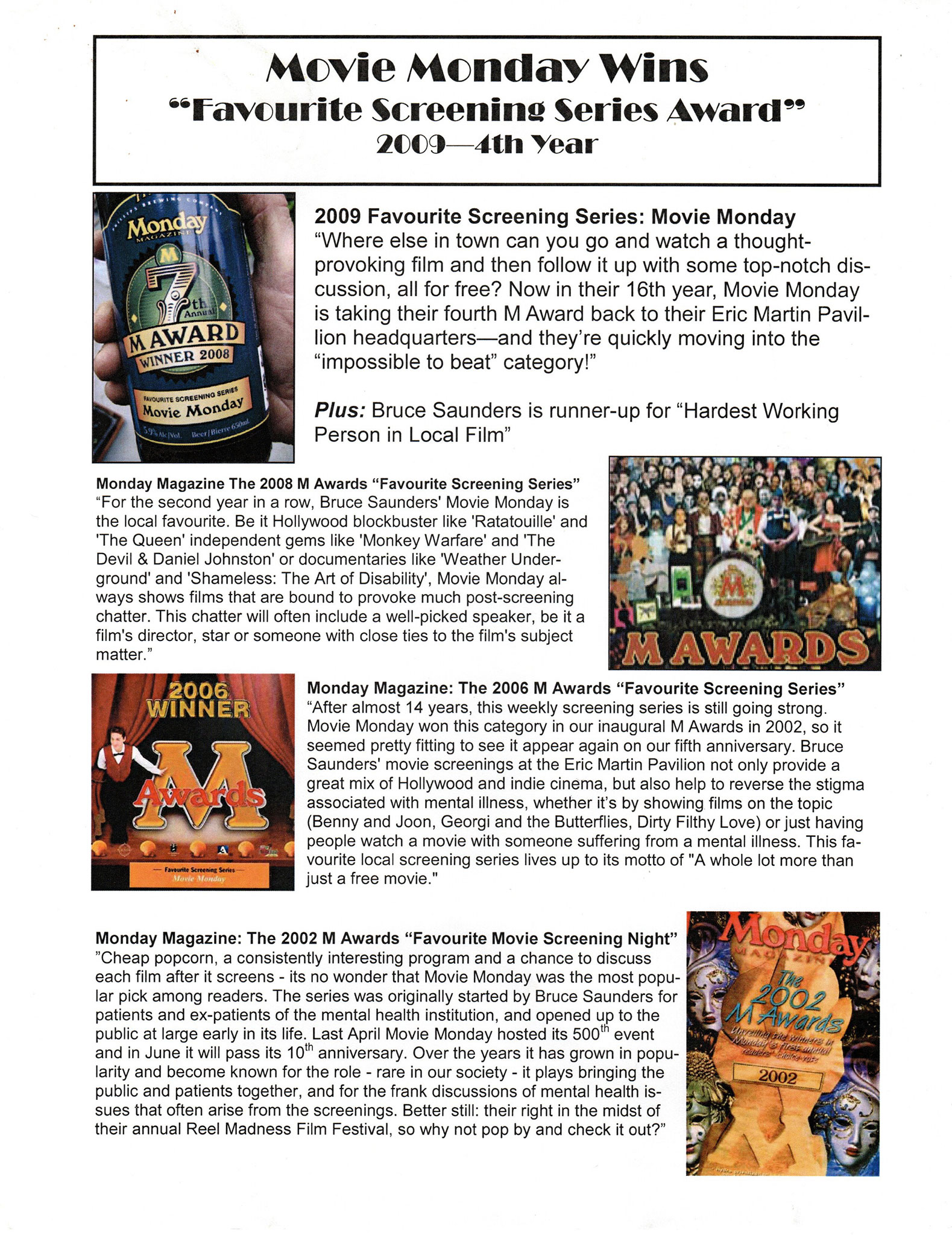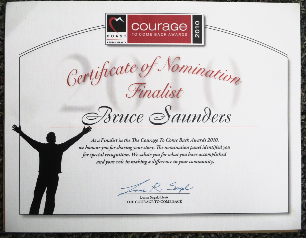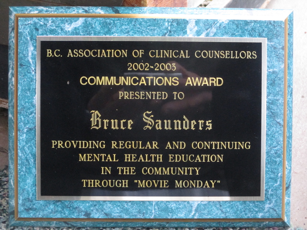 There were some nice acknowledgements along the way from mental health organizations, the Giraffe Project, (for sticking my neck out), Clinical Counsellors of BC, and several from Monday Magazine our arts weekly for favourite screening series, a Courage to Come Back nomination twice, and latterly a Sovereign’s Medal for Volunteers, and Victoria’s Honorary Citizen Award.