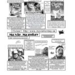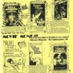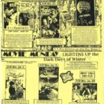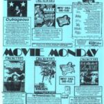 My confidence grew gradually, (being fresh out of the psych ward). I put up 3 more events.Then I settled in to making up programs with six events per page.I was getting my kids to help me enter the text into the 1990ish computer and print it out on the dot matrix printer. Then, I would get the VHS boxes from our neighbourhood video store, take them to the corner copy shop and photocopy them. All this was black and white and laboriously chopped up, pasted up and outlined with felt pen. I did it that way for seven years. A big improvement was when a friend offered to print my program copy on her inkjet printer. But she was across town, so I had to do the drive to pick up that much slicker copy. Eventually we bought our own inkjet printer but for years I was still physically pasting up each program featuring three events on an 81/2 x 14 sheet (they would act as 3-event larger posters) and then reduce-copying two of those to an 8 1/2 x 11 page with Movie Monday logo added to each. Eventually my boys stopped doing the computer work for me, insisting on me doing my own, and I timidly learned with their help.